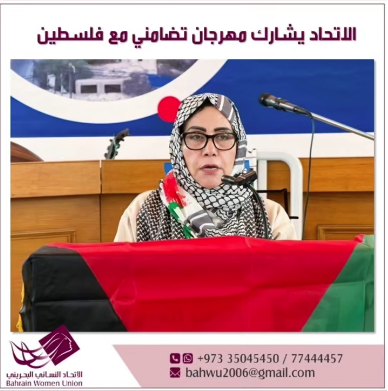 شارك الاتحاد النسائي البحريني في "المهرجان التضامني مع فلسطين" الذي نظمته تنسيقية الجمعيات السياسية في مملكة البحرين. مساء يوم الاثنين الموافق 15 سبتمبر 2025 ، بمقر نادي العروبة بالجفير وقد قدمت الاستاذة هاشمية السيد عضوة مجلس إدارة الاتحاد ،كلمة تضامنية مع الشعب الفلسطيني نيابة عن الاتحاد .كما و حضر الفعالية عضوات من مجلس إدارة الاتحاد ومن عموم الجمعيات النسائية والمجتمع المدني.