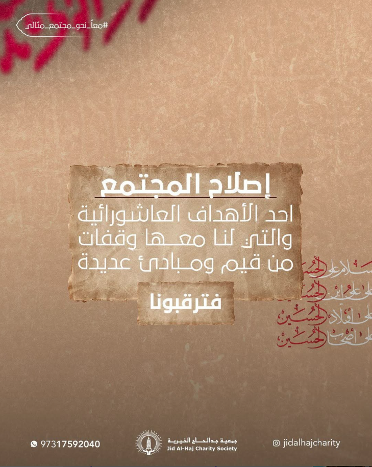 من باب حرص الجمعية الخيرية على نشر القيم والمبادئ المجتمعية والإجتماعية، فقد جعلت من مناسبة عاشوراء الحسين عليه السلام، منطلقاً لأحد أهم المواضيع، والتي تندرج أساساً تحت أهداف عاشوراء، وهي "إصلاح المجتمع"، حيث تم نشر أربعة عشر وقفة مختلفة على حساب الإنستغرام، طوال فترة شهر محرم، بمعدل وقفة واحدة كل يومين، وتضمنت عناوين مختلفة تمس المجتمع مباشرة، مثل بر الوالدين، ومحاربة الإسراف، والتكاتف المجتمعي، والتسامح، وغيرها.