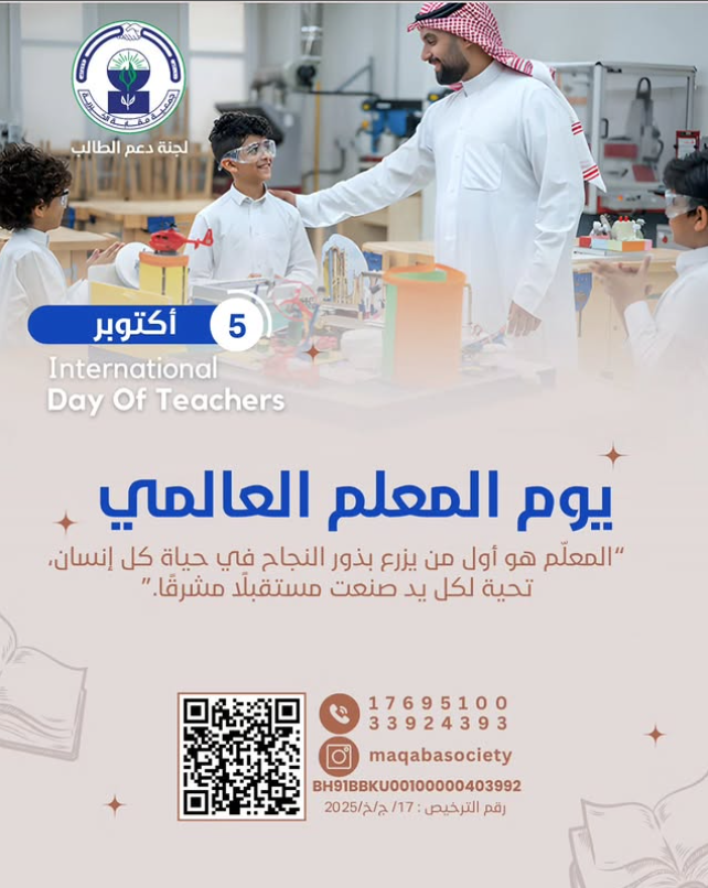 تتقدم جمعية مقابة الخيرية بالشكر والتقدير إلى جميع المعلّمين والمعلمات، على عطائهم اللامحدود، ودورهم العظيم في بناء الأجيال وصناعة مستقبل مشرق لوطننا وأمتنا.
