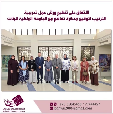 On Wednesday morning, October 8, 2025, at the Royal University for Women, an expanded meeting was held between the university administration and a delegation from the Bahrain Women's Union. During the meeting, an agreement was reached to sign a memorandum of understanding between the Union and the university. The agreement will include provisions for the university's academic staff to conduct workshops and educational lectures.