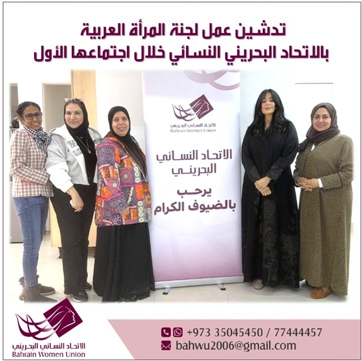 The Arab Women’s Committee of the Bahraini Women’s Union held its first meeting on Wednesday, January 21, at the headquarters of the Bahrain Women Union. Chaired by Dr. Sumaya Al-Jowder, and in the presence of members Professor Fawzia Rabia, Professor Wahiba Abdulrahman Al-Farsi, Professor Zahra Ashkanani, and Engineer Amira Al-Hassan, this was within the framework of launching the work of the committee and discussing its future directions within a common Arab vision.