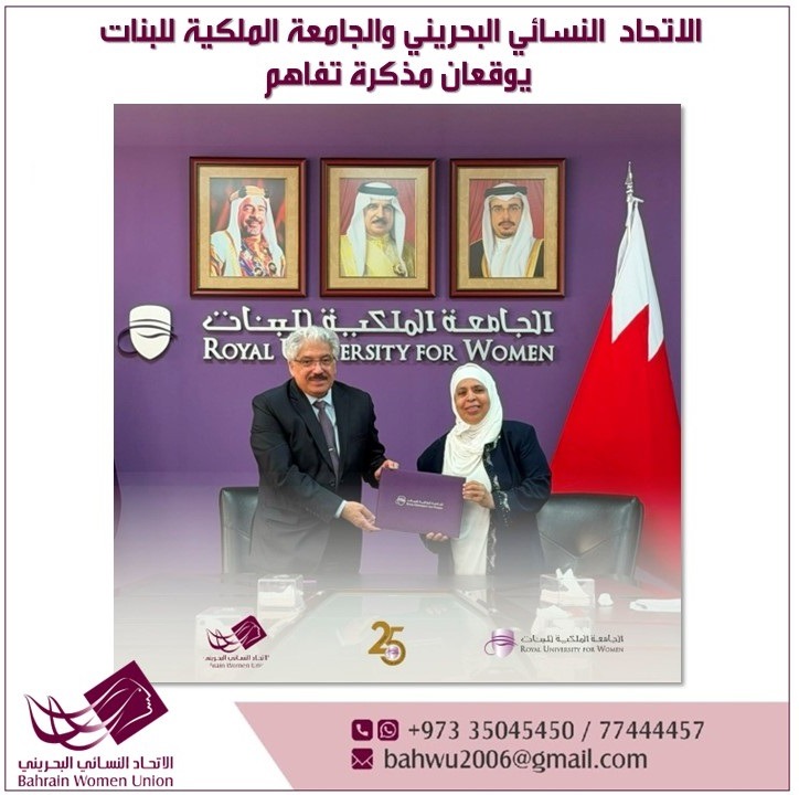 Bahrain Women Union signed a memorandum of understanding with the Royal University for Women. The agreement was signed by Dr. Sumaya Al-Jowder, representing the Bahrain Women’s Union, and Dr. Riyad Yusuf Hamza, President of the Royal University for Women.